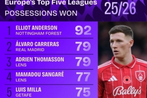 本赛季五大联赛赢得球权榜:安德森居首,卡雷拉斯、莫德里奇在列