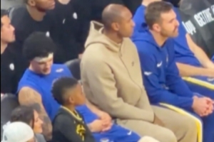 比赛中镜头捕捉到有趣的一幕:追梦上场比赛时,他的儿子小追梦坐在他的位置上认真观看,帮爸爸暖凳子。