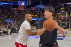赛前,杨瀚森在助教陪同下进行热身,对抗后连续勾手命中,同时送出单臂暴扣,三分7中7。