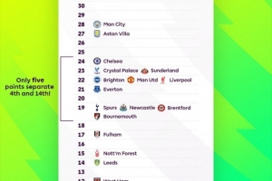 英超官方晒出积分榜,第4名切尔西与第14名伯恩茅斯之间只相差5分,积分榜中上游球队的积分非常接近。