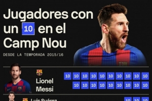 体育资讯11月22日讯 巴萨即将重返诺坎普,Sofascore统计了2015-2016赛季以来球员在诺坎普球场比赛中获评10分的场次,并列出榜单,梅西19场居首。