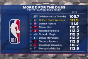 过去三场比赛勇士失分是99/94/91;目前他们防守效率111.9,联盟第二仅次于雷霆。
