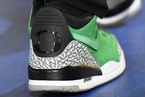 赛前,库里入场时穿着的是俄勒冈大学的专属Air Jordan 3 PE,通常来说这类球鞋是不市售、仅供球队内部的。但还是会有相关人员拿出来售卖,这双球鞋在二级市场的价格接近8000美元。