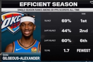 在历史上赛季场均30+的球员中,他的真实命中率69%排名第一,三分命中率44%排名第二,两分命中率60%排名第六,失误1.7最少。
