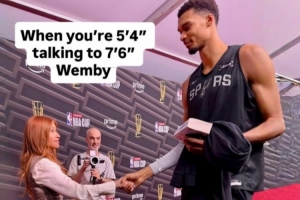 NBA女记者Rachel Nichols晒出了与文班握手照,配文:“当1米63的你和2.32的文班(实为2米24)对话。”