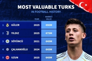 土耳其球员历史身价榜:居莱尔9000万欧居首,伊尔迪兹次席