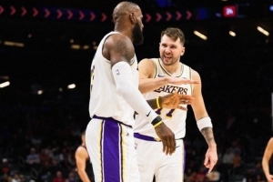 赛后,湖人发布赢球海报,东契奇和詹姆斯登上封面。