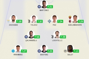 前卫:扎卡尼(拉齐奥,7.28分)、伊尔迪兹(尤文,7.32分)、帕斯(科莫,7.34分)、萨勒马科尔斯(罗马、米兰,7.29分)