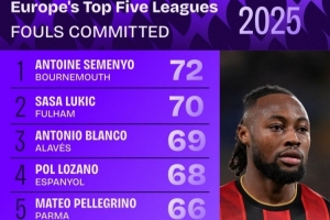 2025年五大联赛犯规次数榜:塞梅尼奥72次最多