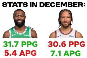在12月,布伦森场均30.6分7.1助攻,三分命中率40.5%,率队取得10胜4负的战绩。