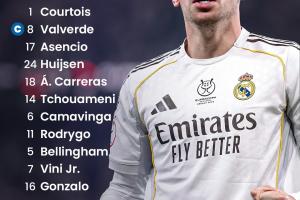 更新后的皇马首发:1-库尔图瓦、8-巴尔韦德、17-阿森西奥、24-赫伊森、18-卡雷拉斯、14-琼阿梅尼、6-卡马文加、11-罗德里戈、5-贝林厄姆、7-维尼修斯、16-贡萨洛·加西亚