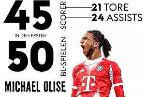 数据统计显示,奥利塞德甲生涯前50场直接参与45球(21球24助攻)。
