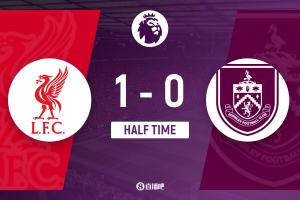 上半场比赛结束,利物浦1-0伯恩利。